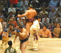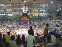 スポーツニュースを見て、それを再確認した次第です。 いま、大相撲人気を担っているのは、まさしく、高見盛だろう。 そして、その注目の一番、なんと、勝っちゃったのである。高見盛が… 場内はこの世とは思えないほどの盛り上がり様である。 眼前に、紫色の座布団がまるでフリスビーの様に舞う。 弓取り式が始まっていると言うのに、まだ座布団が舞っている始末だ。 オレも座布団投げをしたかったが、できなかった。 椅子席なもんで…ずっと、後ろの。 しかし、上から見る座布団乱舞はなかなか壮観な眺めだった。