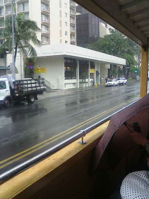 21(水) 【23:00】 ▼飛行機の墜落もなく、予定通りホノルル空港到着。現地時間、朝8時くらい。 空はどんより曇っており、いまにも雨が降りそうである。 ▼5人でアラモアナ・ショッピングセンターへ、これと言ってあてもないがとにかく向かう。トロリーバスを使用。市内を循環しているバスなのだが、このバスには窓にガラスがない。実にオープンなハワイらしいバスである。そこへ来てこの天気である。バスが発車したとたん雨が降り出した。それも土砂降りである。通常はあるであろう窓の部分から止めどもなく雨が降り注ぐ。中にはバスの中で傘を刺す客までいる始末だ。 狭いバスの中である。雨宿りする場所もなく、雨は容赦なくオレ達の体を打ち付ける。 ハワイ初日からずぶぬれである。 お決まり通り、バスが到着すると同時に雨はすっかり止んだ。 こうしていきなりハワイ的スコールの洗礼を受けたのだった。