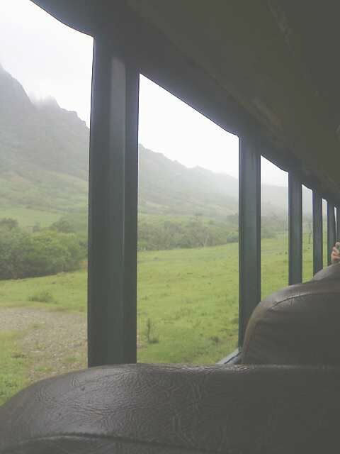 特筆すべきは、例によってここのバスも窓がない。そして…雨である。 吹き込む雨でシートはずぶ濡れ状態。したがって、座れたもんじゃないよ。 外を見れば、この雨の中をバギーで走る人達。とてもワイルドである。