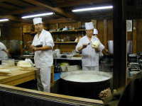 紅葉の間を抜けて奥へと入って行くと広場があり、そこに食べ物屋が軒を連ねている。中でも本場の中国人がやっている店の中華麺は逸品である。料理人が麺を切っているところも見ることができる。