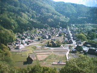 | 世界遺産となっている白川郷合掌村は、昔ながらの町並みを残した集落群である。 場所は、東海北陸自動車道の終点の白鳥で降りて国道158号を1時間半ほど行ったところである。 まず行ってみて感じたことは、想像とは違い、普通に暮らしている普通の古い家の集まりという感じだった。 冬の雪に埋もれている姿はまた違った趣があるのだろうが、冬にこんなところへはとても来れんだろうなあ。 |